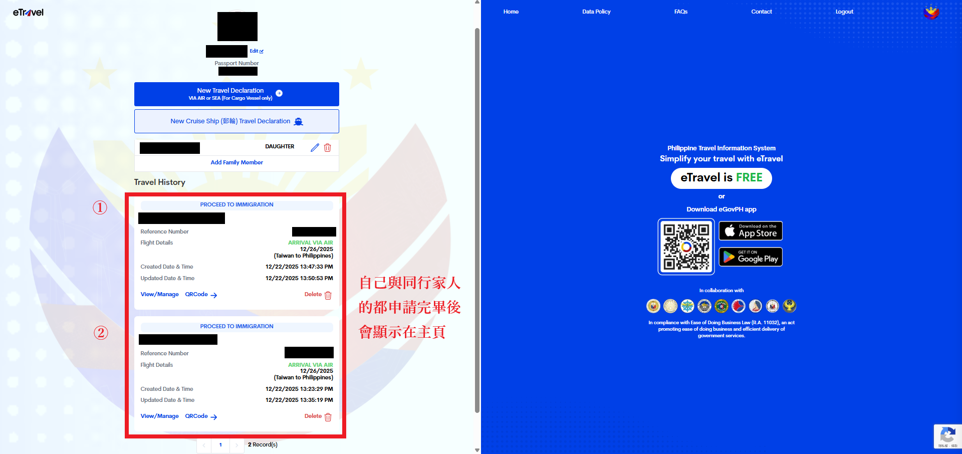 點選上圖「Back to Home」,即可在主頁確認所有人的電子入境卡。